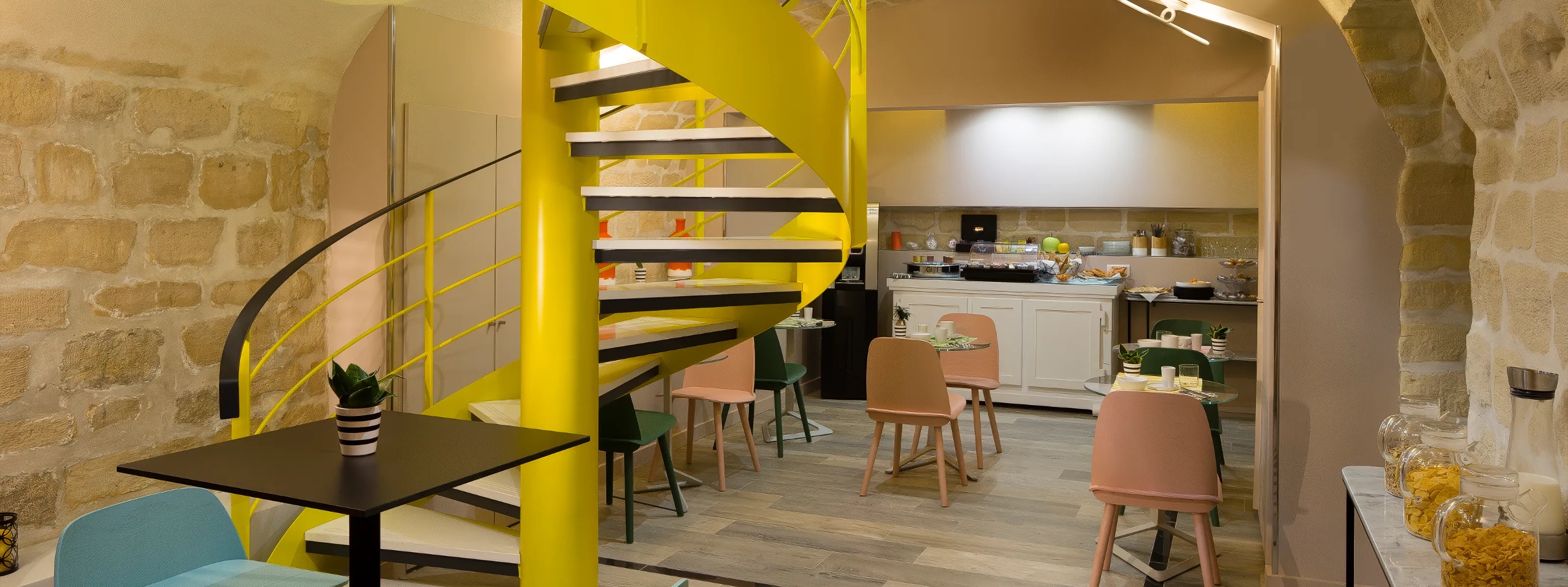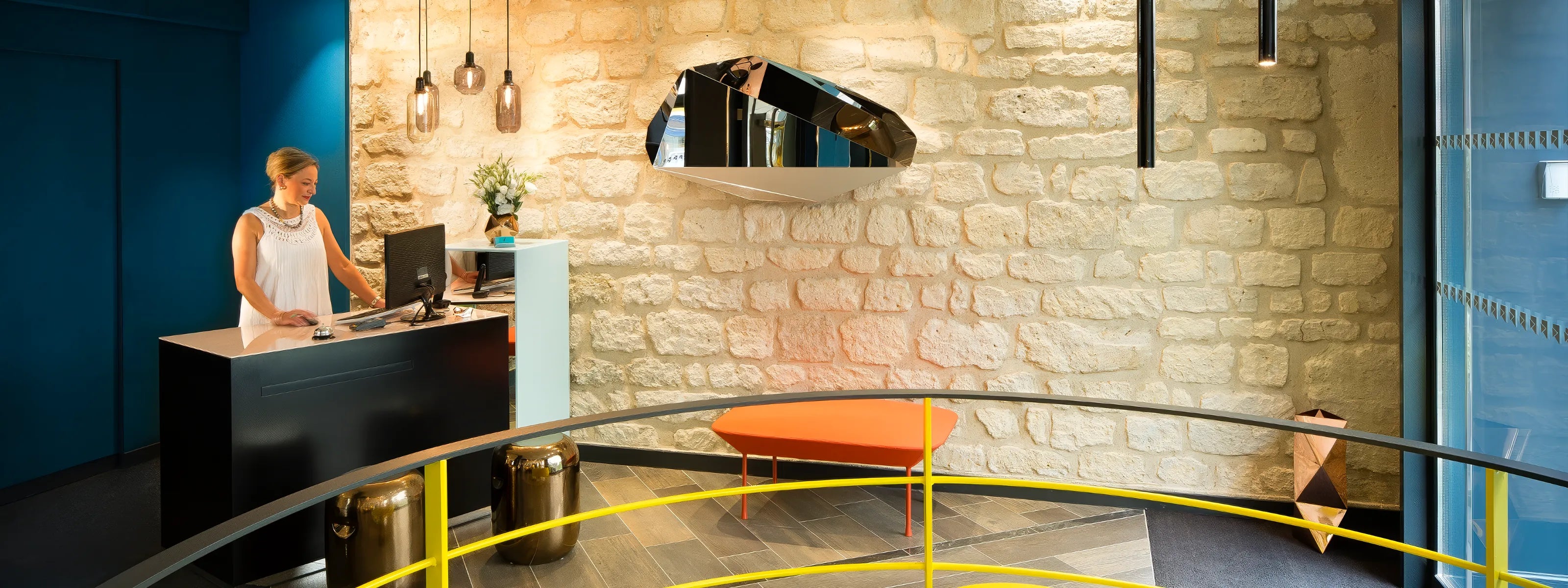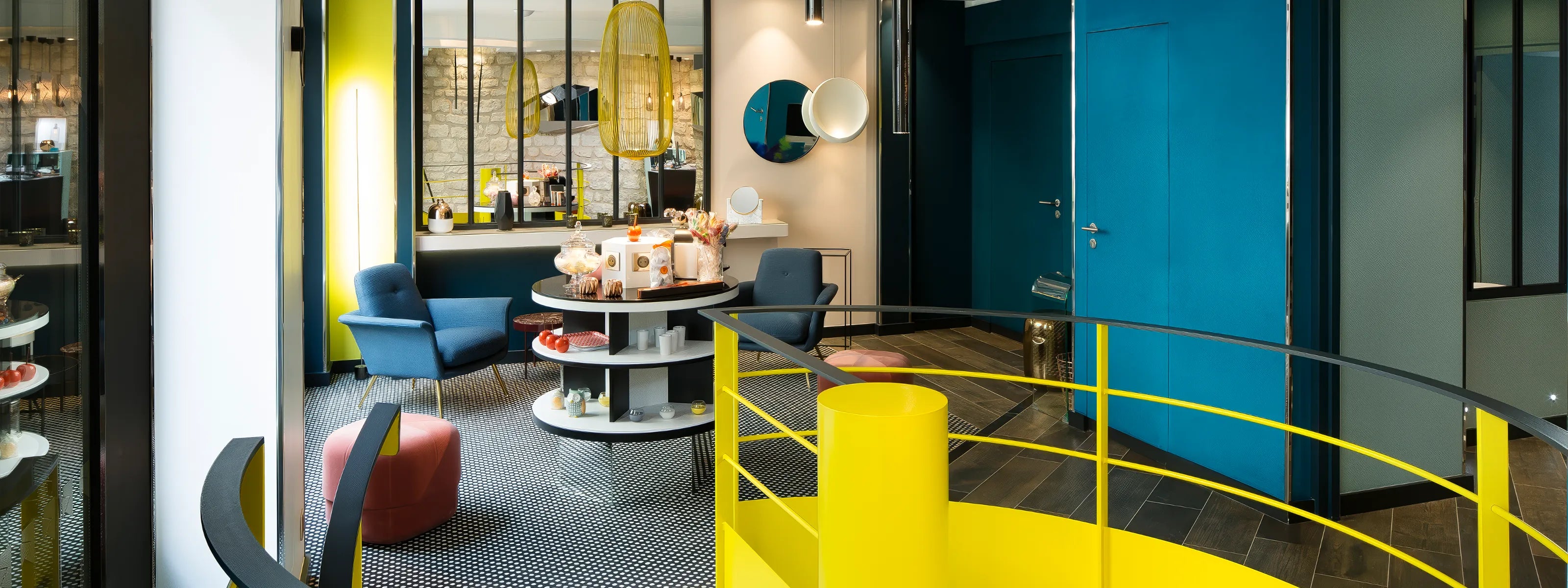 Just a stone's throw from the Villiers metro station, between Parc Monceau and the Batignolles village, the secluded Rue de Lévis offers a new, ideal location for romantic getaways in the capital. Nestled in a shopping alleyway, the Hôtel Duette is one of VeryChic's most delightful discoveries. Opening its doors to a colorful, designer lobby, this boutique hotel welcomes its guests into a friendly and invigorating atmosphere. The tone is set, with old and new intertwined between the exposed stone walls and the vaulted cellar, where guests descend for breakfast.